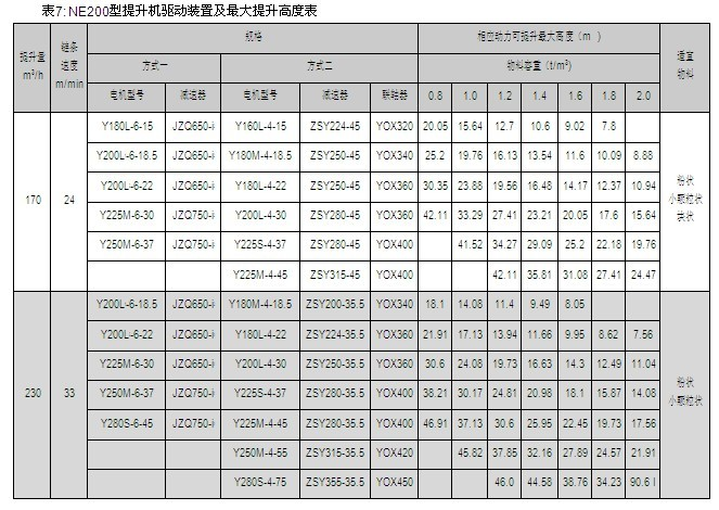 NE15、NE30、NE50、NE100、NE150、NE200、NE300、NE400型提升機的提升量上限、提升高度上限及動力配備表見表2~9,選擇NE500、NE600、NE800型提升機時,請與本公司技術(shù)部聯(lián)系。
