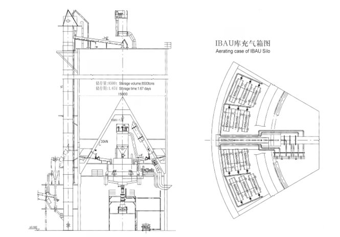 IBAU均化庫(kù)是我們南通江森機(jī)械制造有限公司采用德國(guó)尹堡公司的連續(xù)均化技術(shù),經(jīng)國(guó)產(chǎn)化設(shè)計(jì)在水泥行業(yè)得到廣泛應(yīng)用的一款均化設(shè)備。均化庫(kù)的庫(kù)底中心設(shè)一大圓錐,庫(kù)內(nèi)生料的重量通過(guò)該錐體傳遞給庫(kù)壁,庫(kù)底環(huán)形空間分成向中心傾斜10°的6個(gè)(或多個(gè))充氣區(qū),每個(gè)充氣區(qū)設(shè)一個(gè)卸料口,卸料口的上方用一個(gè)徑向放置的減壓錐將料層隔開(kāi),不讓卸料口上方的料流直接進(jìn)入卸料口,整個(gè)環(huán)形區(qū)生料在各區(qū)中有兩個(gè)以自上而下切割水平料層的流動(dòng)而產(chǎn)生重力混合均化的料柱,再經(jīng)卸料口兩側(cè)形成料流的對(duì)流混合流向卸料口,圓錐下設(shè)外攪拌倉(cāng),各區(qū)的生料循環(huán)進(jìn)入攪拌倉(cāng)后,經(jīng)連續(xù)強(qiáng)烈的充氣攪拌得到進(jìn)一步均化。均化比為6-8,耗電為0.1-0.2kW/t。