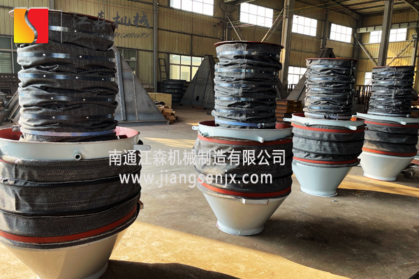 ※伸縮節(jié)特點(diǎn):伸縮節(jié)分為內(nèi)外兩層(內(nèi)層卸料,外層收塵),伸縮節(jié)的升降采用3根繩索來(lái)拉動(dòng),如左圖所示,通過(guò)鋼絲繩的拉力,可防止在收塵過(guò)程中由于收塵的負(fù)壓使外層布袋被吸癟的缺點(diǎn),從而保證了伸縮節(jié)之間的收塵通道通暢,又增強(qiáng)了伸縮節(jié)的使用壽命。外層使用防雨帆布。